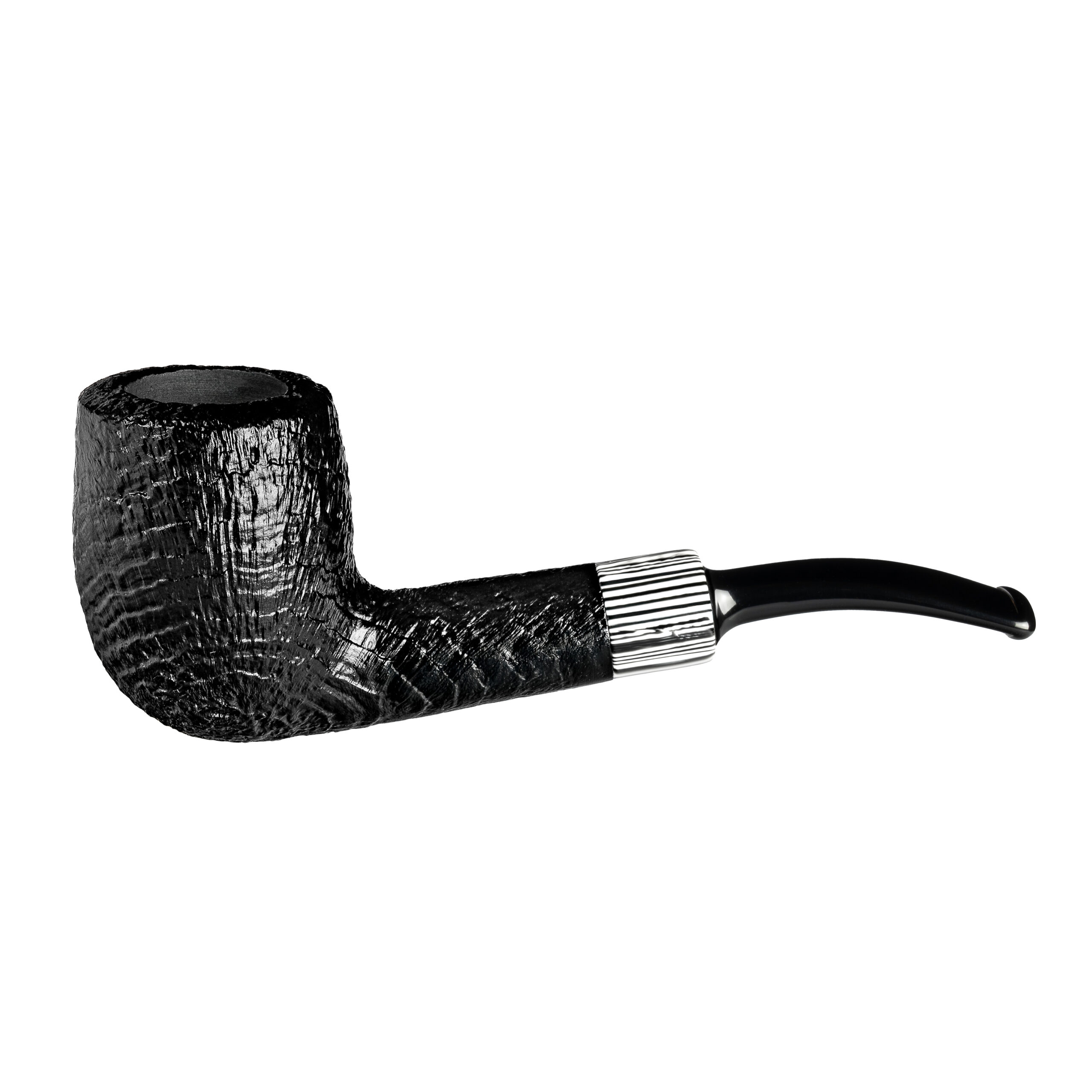 Die schwarze, sandgestrahlte Oberfläche und der auffällige Zebramusterring machen diese Pfeife zu einem Blickfang. Das schwarze Mundstück und die sechs verschiedenen Kopfformen unterstreichen ihre Vielseitigkeit. Diese Pfeife ist die perfekte Wahl für Genießer, die den rauen Charme der Natur mit einem Hauch von Eleganz verbinden möchten.
